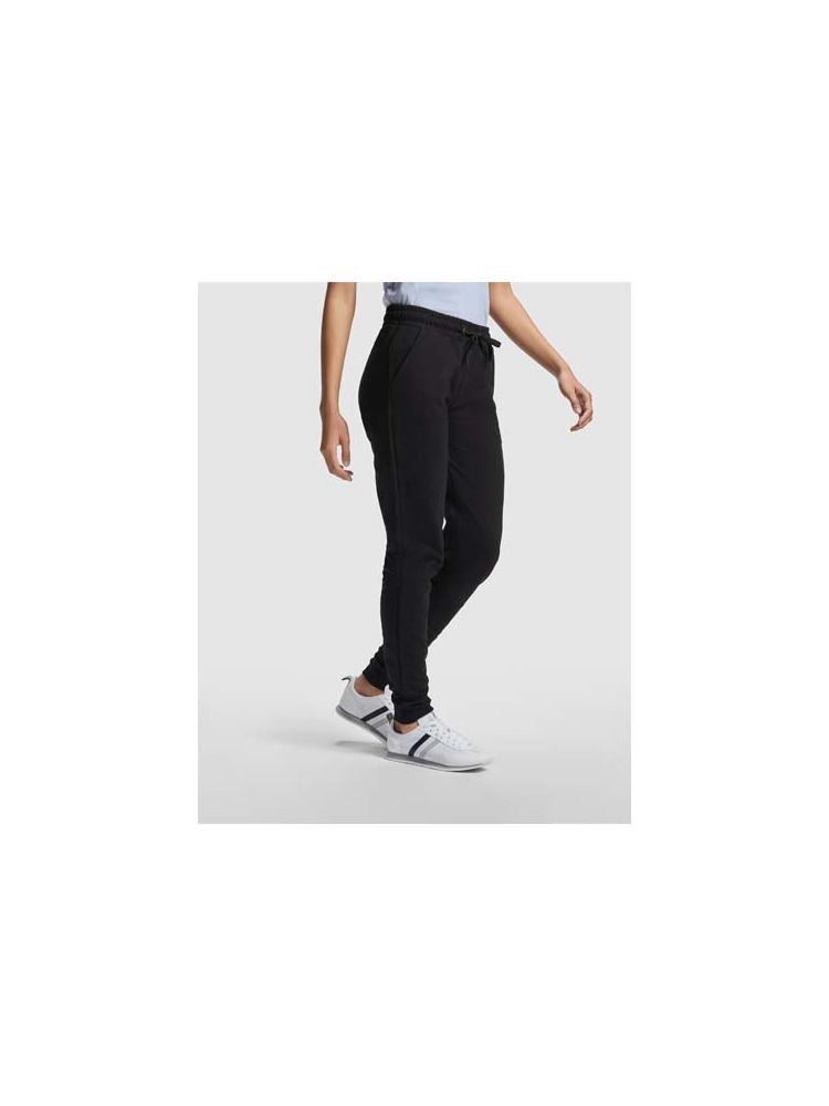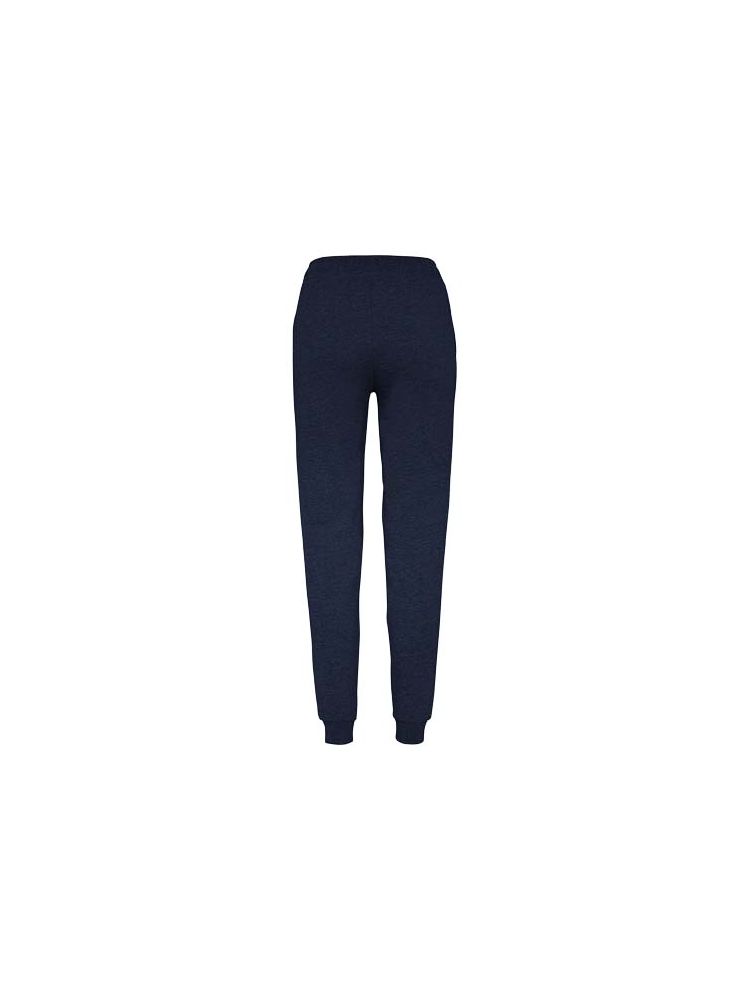 Sportowe spodnie z szerokim regulowanym pasem, sznurkiem do ściągania, dopasowanymi ściągaczami na nogawkach, wzmocnionymi szwami, prążkowanymi kieszeniami bocznymi i narożną tylną kieszenią z przeszyciem. Usuwalna etykieta.