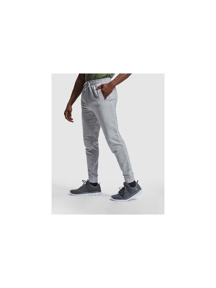 Sportowe spodnie z szerokim regulowanym pasem, sznurkiem do ściągania, dopasowanymi ściągaczami na nogawkach, wzmocnionymi szwami, prążkowanymi kieszeniami bocznymi i narożną tylną kieszenią z przeszyciem. Usuwalna etykieta.