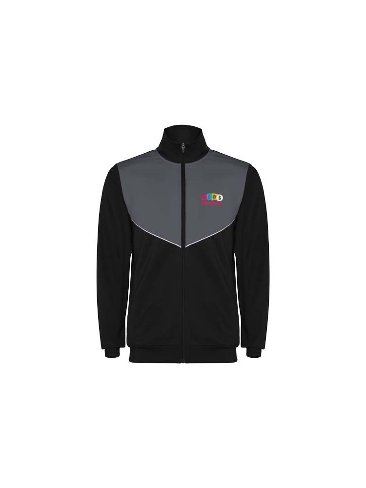 Dres z lekkiego i elastycznego materiału. Kurtka w kontrastowym kolorze z przeszyciami na klatce piersiowej. Wysoki kołnierz z kontrastowymi szwami. Zamek błyskawiczny po środku z przodu. Boczne kieszenie. Mankiety i talia wykończone ściągaczem 2×2. Spodnie z gumką w pasie i sznurkiem. Kontrastująca część z boku nogawki wykończona lamówką. Zamek błyskawiczny na dole nogawek.
