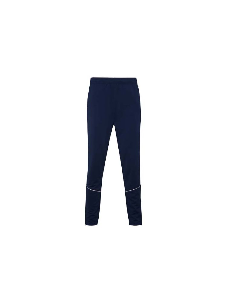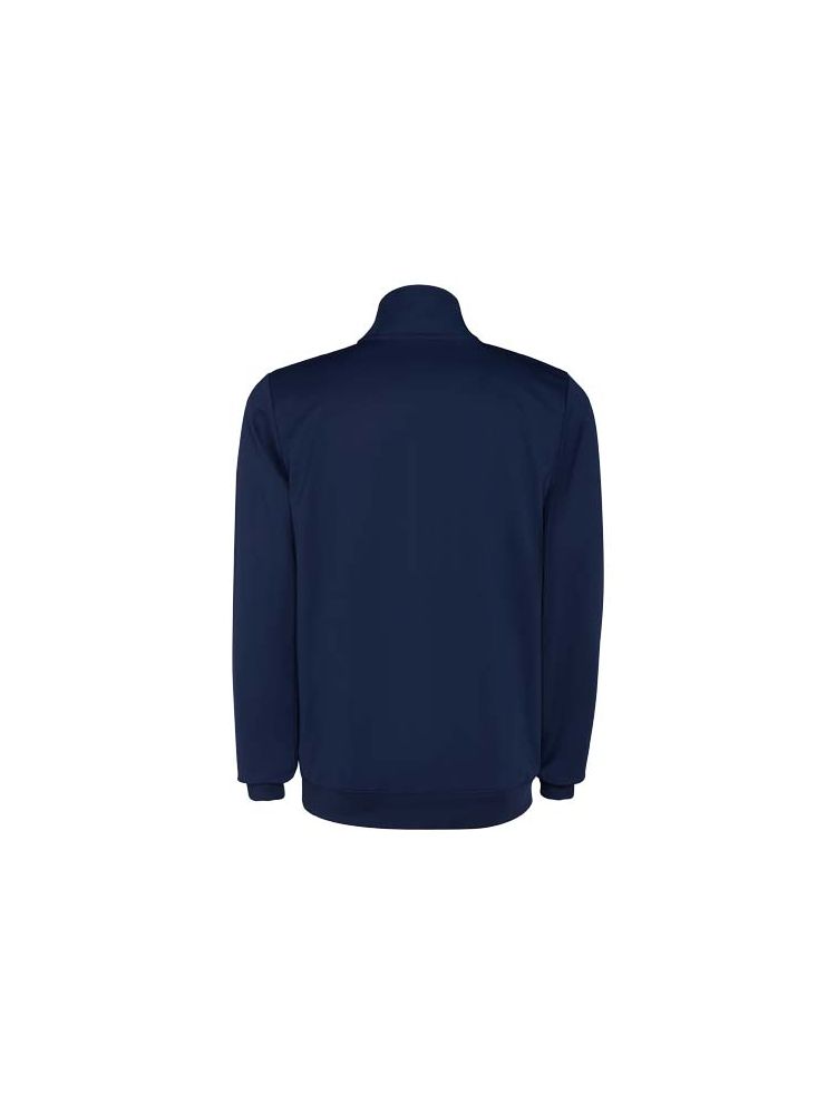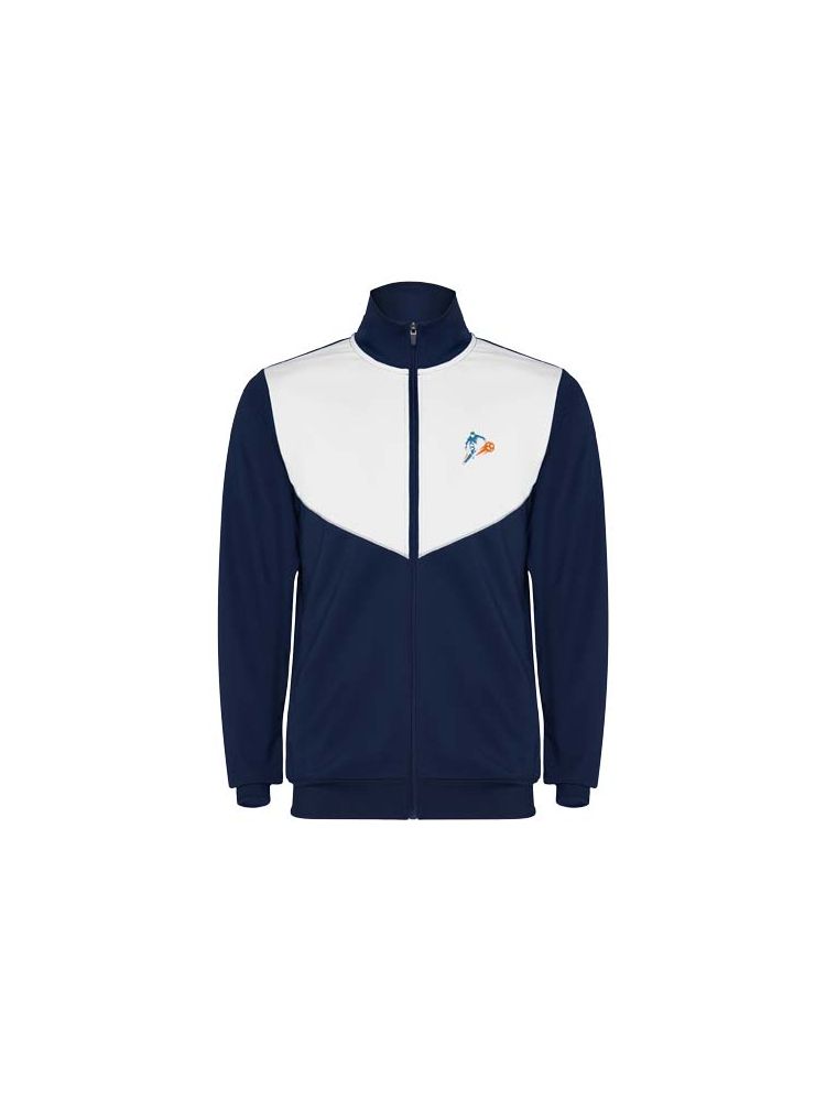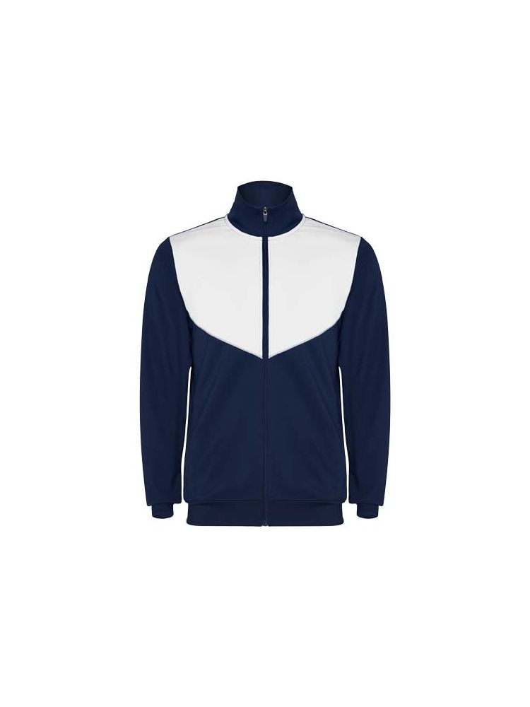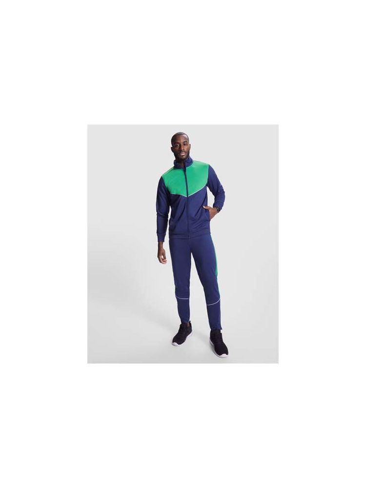 Dres z lekkiego i elastycznego materiału. Kurtka w kontrastowym kolorze z przeszyciami na klatce piersiowej. Wysoki kołnierz z kontrastowymi szwami. Zamek błyskawiczny po środku z przodu. Boczne kieszenie. Mankiety i talia wykończone ściągaczem 2×2. Spodnie z gumką w pasie i sznurkiem. Kontrastująca część z boku nogawki wykończona lamówką. Zamek błyskawiczny na dole nogawek.