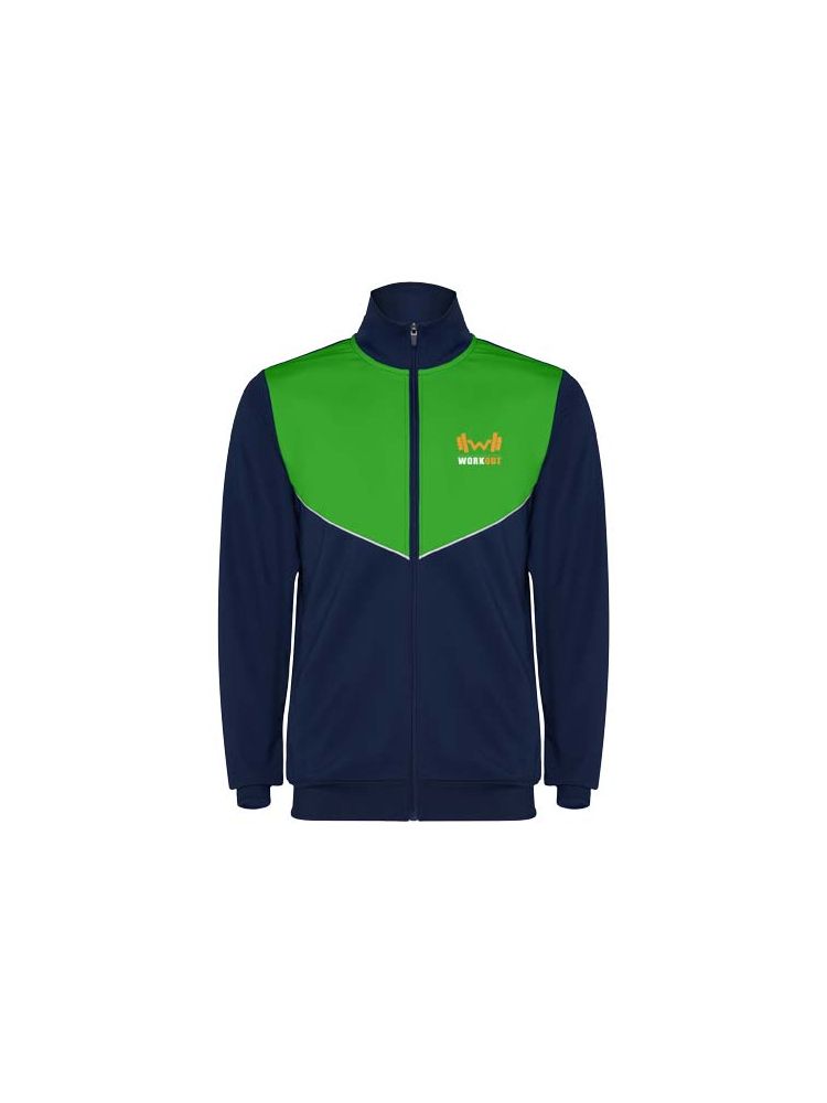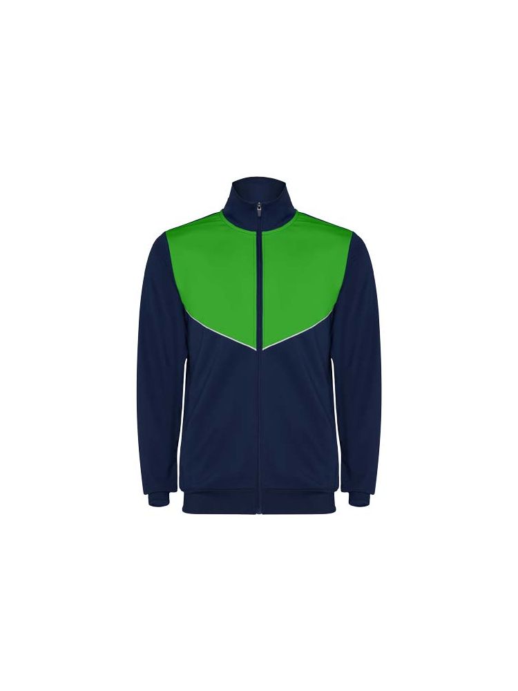 Dres z lekkiego i elastycznego materiału. Kurtka w kontrastowym kolorze z przeszyciami na klatce piersiowej. Wysoki kołnierz z kontrastowymi szwami. Zamek błyskawiczny po środku z przodu. Boczne kieszenie. Mankiety i talia wykończone ściągaczem 2×2. Spodnie z gumką w pasie i sznurkiem. Kontrastująca część z boku nogawki wykończona lamówką. Zamek błyskawiczny na dole nogawek.