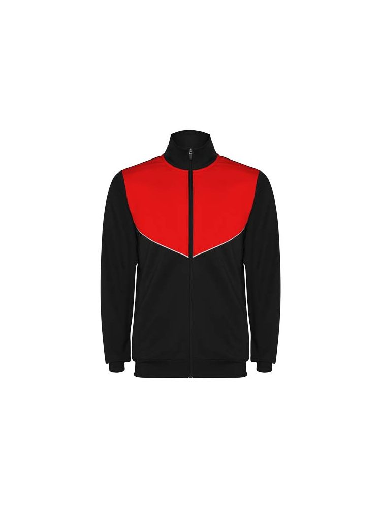 Dres z lekkiego i elastycznego materiału. Kurtka w kontrastowym kolorze z przeszyciami na klatce piersiowej. Wysoki kołnierz z kontrastowymi szwami. Zamek błyskawiczny z przodu na środku. Boczne kieszenie. Mankiety i talia wykończone ściągaczem 2×2. Spodnie z gumką w pasie i sznurkiem. Kontrastująca część z boku nogawki wykończona lamówką. Zamek błyskawiczny na dole nogawek.