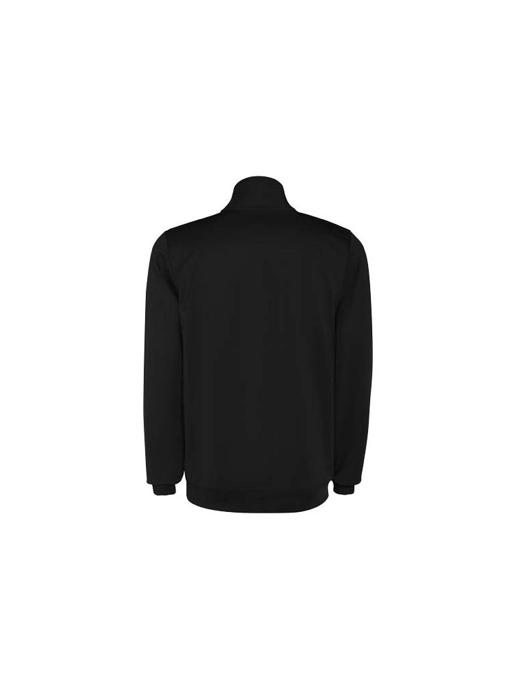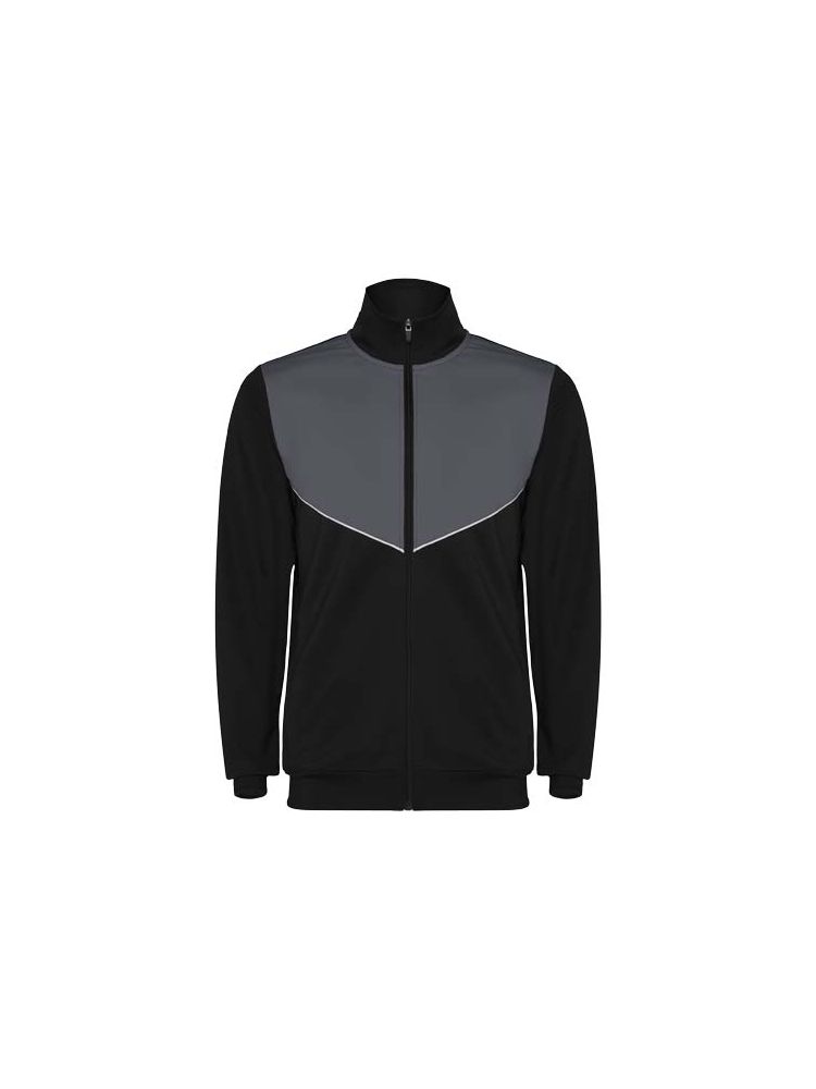 Dres z lekkiego i elastycznego materiału. Kurtka w kontrastowym kolorze z przeszyciami na klatce piersiowej. Wysoki kołnierz z kontrastowymi szwami. Zamek błyskawiczny z przodu na środku. Boczne kieszenie. Mankiety i talia wykończone ściągaczem 2×2. Spodnie z gumką w pasie i sznurkiem. Kontrastująca część z boku nogawki wykończona lamówką. Zamek błyskawiczny na dole nogawek.