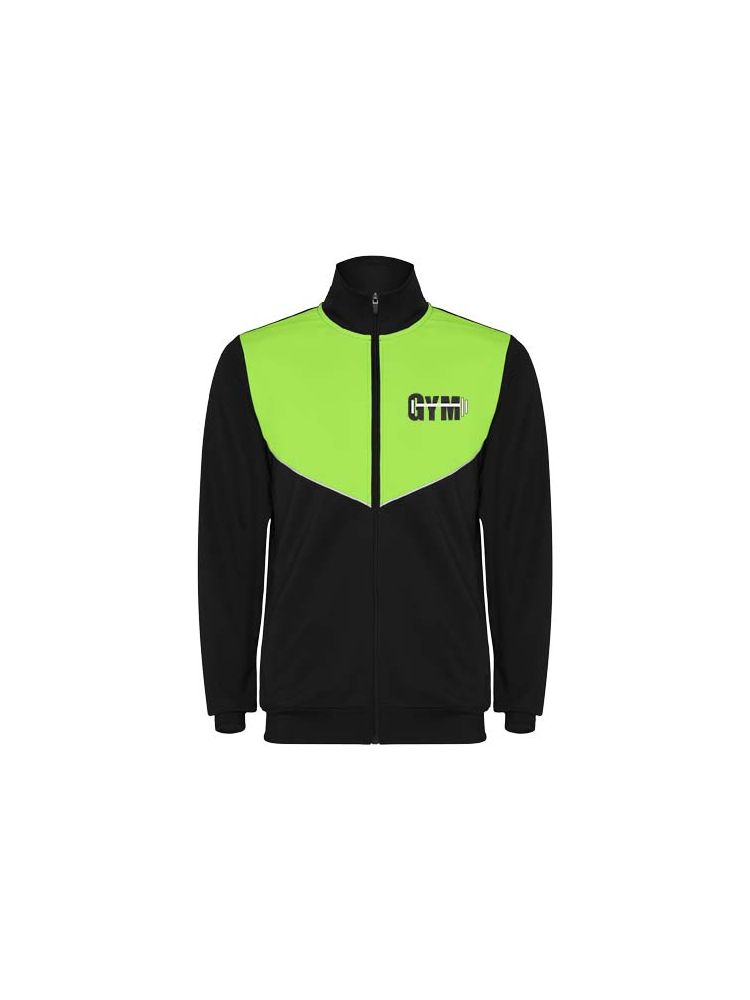 Dres z lekkiego i elastycznego materiału. Kurtka w kontrastowym kolorze z przeszyciami na klatce piersiowej. Wysoki kołnierz z kontrastowymi szwami. Zamek błyskawiczny z przodu na środku. Boczne kieszenie. Mankiety i talia wykończone ściągaczem 2×2. Spodnie z gumką w pasie i sznurkiem. Kontrastująca część z boku nogawki wykończona lamówką. Zamek błyskawiczny na dole nogawek.