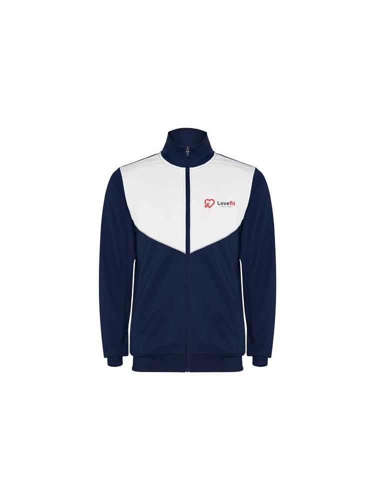 Dres z lekkiego i elastycznego materiału. Kurtka w kontrastowym kolorze z przeszyciami na klatce piersiowej. Wysoki kołnierz z kontrastowymi szwami. Zamek błyskawiczny z przodu na środku. Boczne kieszenie. Mankiety i talia wykończone ściągaczem 2×2. Spodnie z gumką w pasie i sznurkiem. Kontrastująca część z boku nogawki wykończona lamówką. Zamek błyskawiczny na dole nogawek.