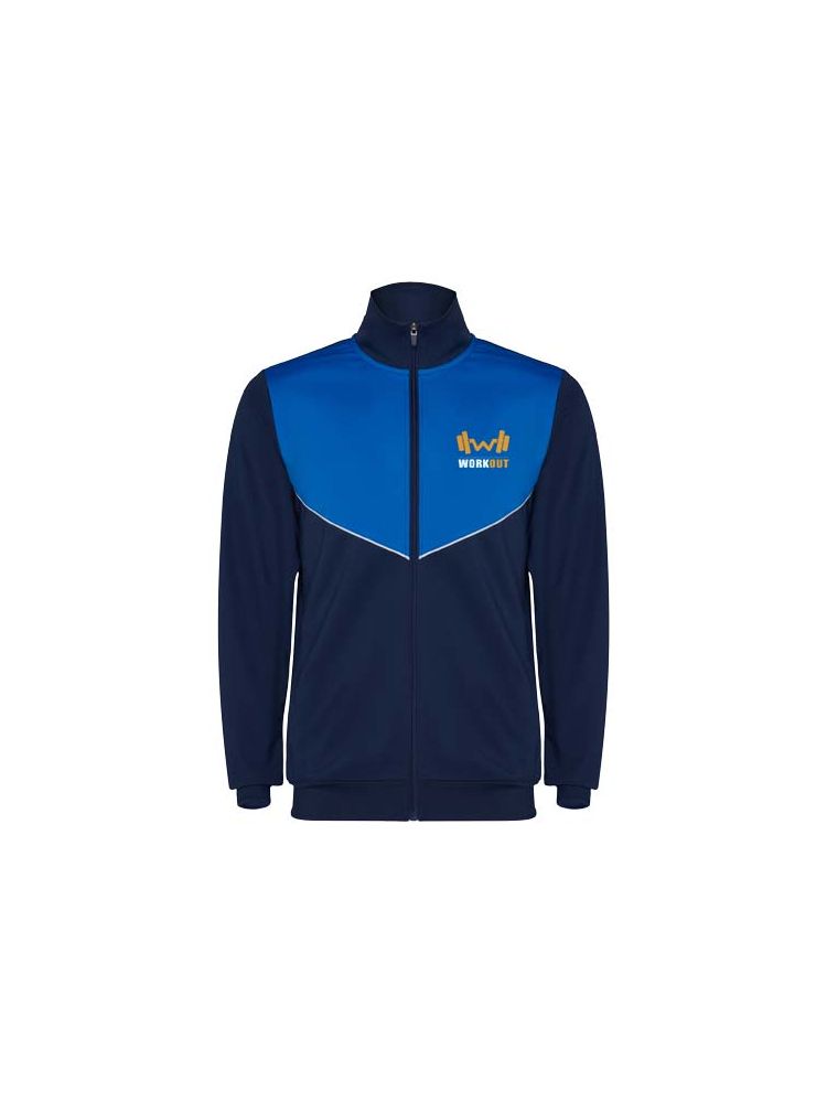 Dres z lekkiego i elastycznego materiału. Kurtka w kontrastowym kolorze z przeszyciami na klatce piersiowej. Wysoki kołnierz z kontrastowymi szwami. Zamek błyskawiczny z przodu na środku. Boczne kieszenie. Mankiety i talia wykończone ściągaczem 2×2. Spodnie z gumką w pasie i sznurkiem. Kontrastująca część z boku nogawki wykończona lamówką. Zamek błyskawiczny na dole nogawek.