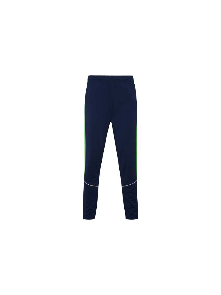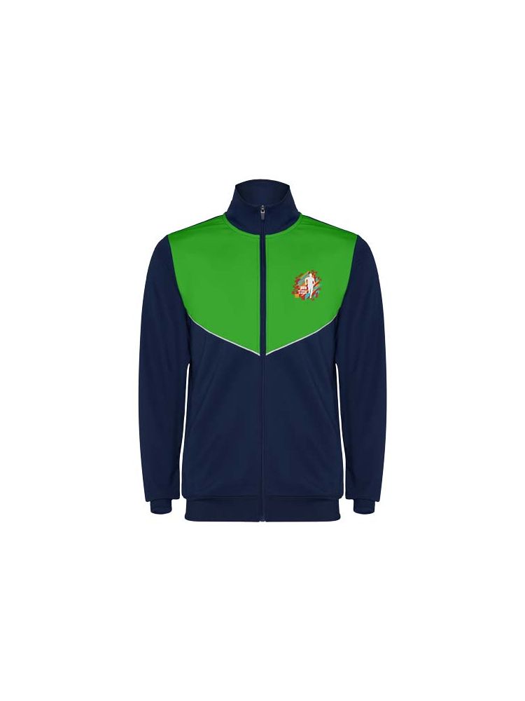 Dres z lekkiego i elastycznego materiału. Kurtka w kontrastowym kolorze z przeszyciami na klatce piersiowej. Wysoki kołnierz z kontrastowymi szwami. Zamek błyskawiczny z przodu na środku. Boczne kieszenie. Mankiety i talia wykończone ściągaczem 2×2. Spodnie z gumką w pasie i sznurkiem. Kontrastująca część z boku nogawki wykończona lamówką. Zamek błyskawiczny na dole nogawek.