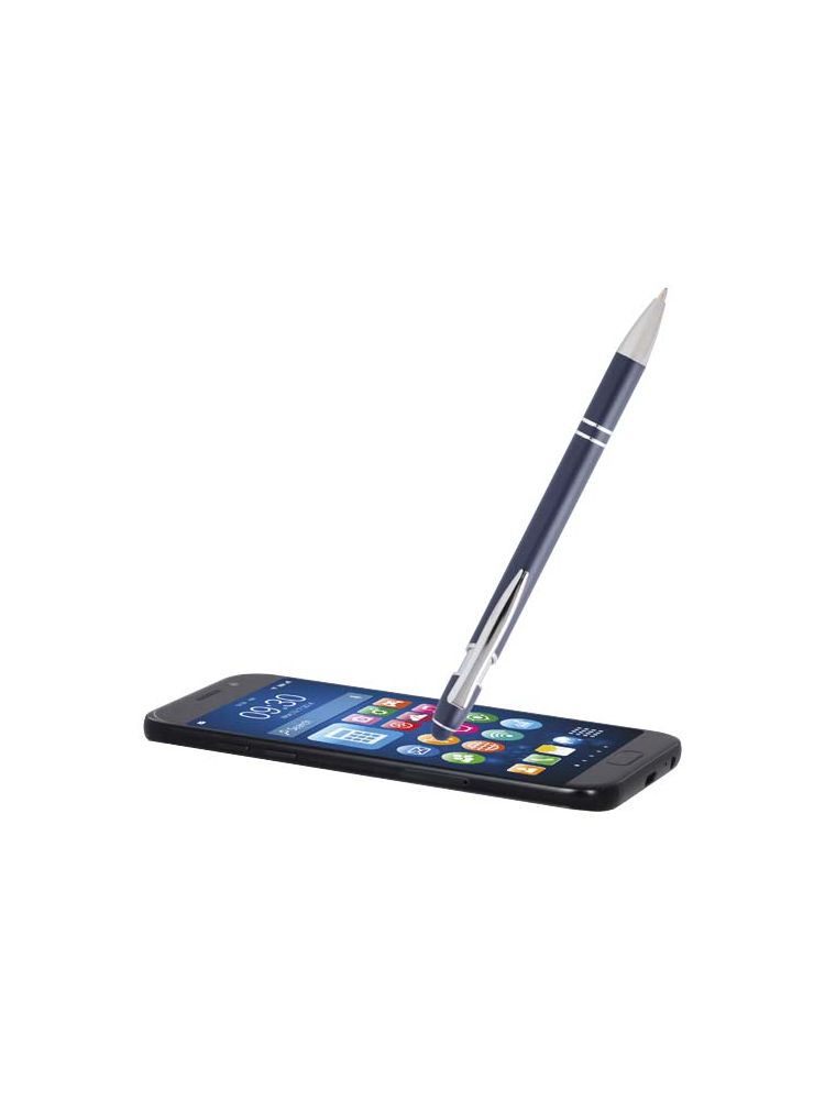 Długopis Kish ze srebrnym wykończeniem ma korpus wykonany z aluminium z recyklingu i rysik dotykowy wykonany z silikonu. Aluminium z recyklingu ogranicza ilość odpadów na wysypiskach śmieci i pomaga chronić zasoby naturalne w celu zmniejszenia emisji gazów cieplarnianych. Kolor tuszu: Niebieski. Żywotność: 800 metrów. Rozmiar stalówki: 1,0 mm.