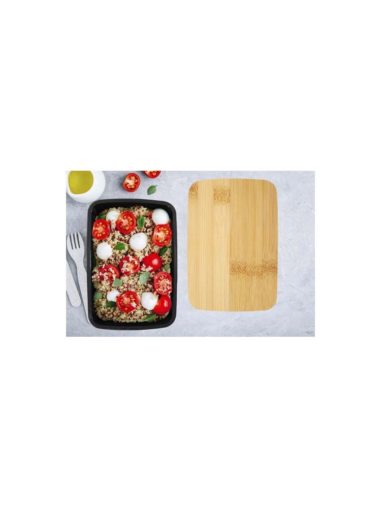 Mangi pudełko śniadaniowe o pojemności 500 ml wykonane z tworzyw sztucznych pochodzących z recyklingu. Posiada bambusową pokrywkę i elastyczną opaskę, która utrzymuje pokrywkę na miejscu, zapewniając, że zawartość pozostanie świeża.