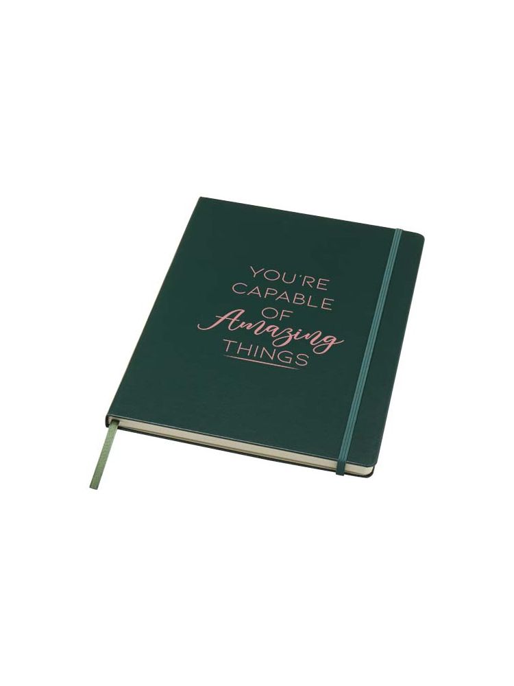 Objęty wzorem zastrzeżonym, klasyczny notatnik A4 z twardą okładką, zamykany na gumkę. Zawiera 80 kartek (80 g/m²) w linie, idealnych do zapisywania i dzielenia się notatkami. Z tyłu ma rozkładaną kieszonkę na małe karteczki. Dołączone etui upominkowe Journalbooks. Karton pokryty papierem imitującym skórę.