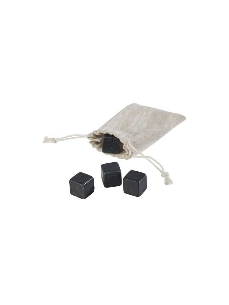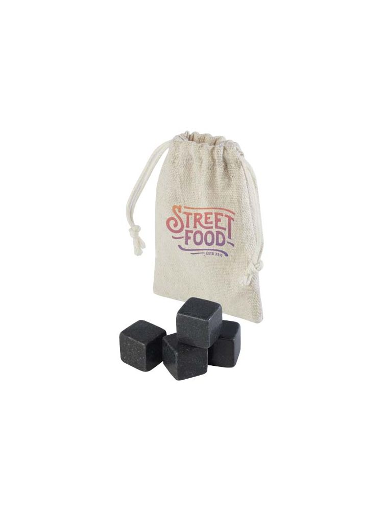Zestaw 4 kamiennych kostek lodu wielokrotnego użytku w płóciennym etui. Kostki te szybko i skutecznie schładzają napoje, zachowując jednocześnie ich smak.