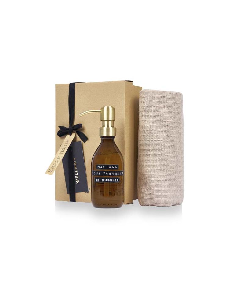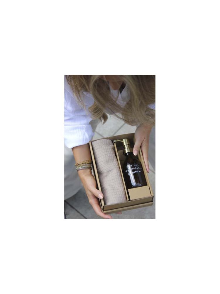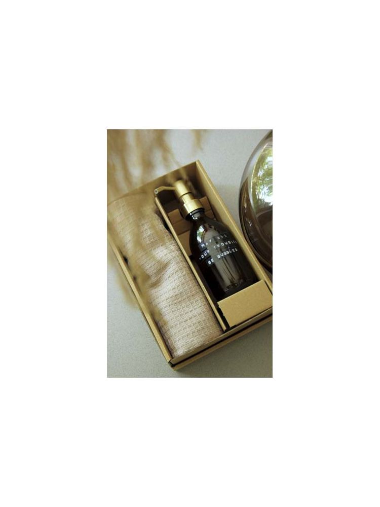Zestaw upominkowy zawierający mydło do rąk o zapachu bambusa o pojemności 250 ml i beżową ściereczkę wykonaną z bawełny organicznej. Zestaw doskonale sprawdzi się jako prezent na każdą okazję.
