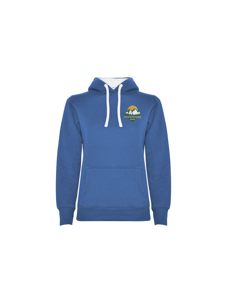 Bluza o dopasowanym kroju z dwukolorowym kapturem z podwójnego materiału, kontrastowym regulowanym sznurkiem, krytymi szwami w kołnierzu i kieszenią kangurką. Ściągacze 1×1 z elastanu w mankietach i u dołu bluzy. Rozcięcie na kciuk. Usuwalna metka.