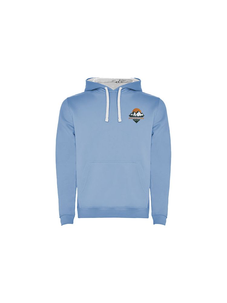 Dwukolorowa bluza z kapturem z podwójnego materiału, kontrastowym regulowanym sznurkiem, wzmocnionymi krytymi szwami w kołnierzu i kieszenią typu kangurka. Ściągacze 1×1 z elastanu w mankietach i pasie. Usuwalna metka.