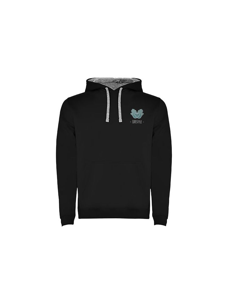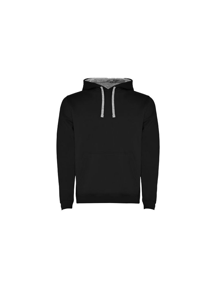 Dwukolorowa bluza z kapturem z podwójnego materiału, kontrastowym regulowanym sznurkiem, wzmocnionymi krytymi szwami w kołnierzu i kieszenią typu kangurka. Ściągacze 1×1 z elastanu w mankietach i pasie. Usuwalna metka.