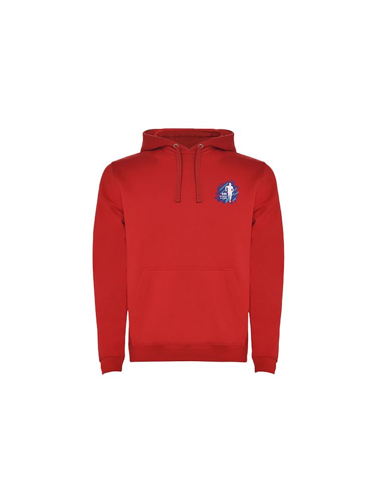 Dwukolorowa bluza z kapturem z podwójnego materiału, kontrastowym regulowanym sznurkiem, wzmocnionymi krytymi szwami w kołnierzu i kieszenią typu kangurka. Ściągacze 1×1 z elastanu w mankietach i pasie. Usuwalna metka.