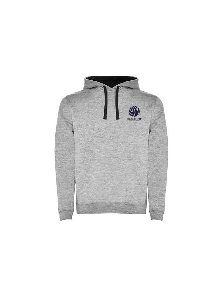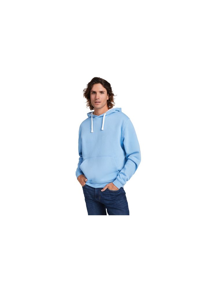 Dwukolorowa bluza z kapturem z podwójnego materiału, kontrastowym regulowanym sznurkiem, wzmocnionymi krytymi szwami w kołnierzu i kieszenią typu kangurka. Ściągacze 1×1 z elastanu w mankietach i pasie. Usuwalna metka.