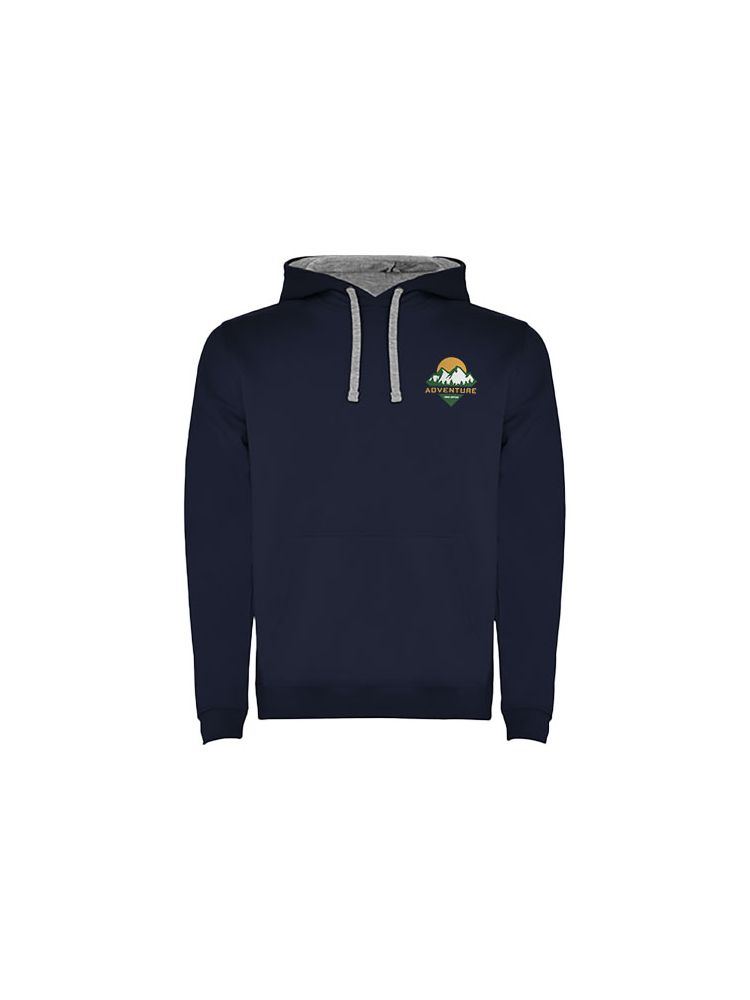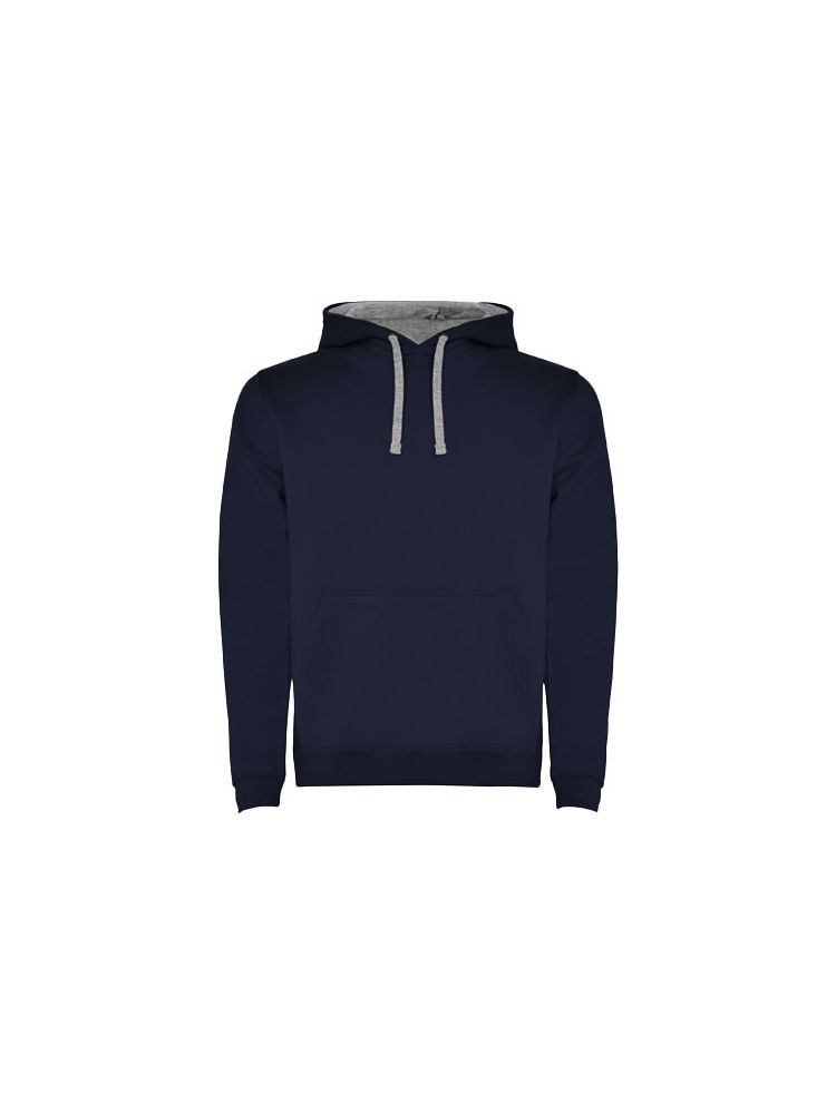 Dwukolorowa bluza z kapturem z podwójnego materiału, kontrastowym regulowanym sznurkiem, wzmocnionymi krytymi szwami w kołnierzu i kieszenią typu kangurka. Ściągacze 1×1 z elastanu w mankietach i pasie. Usuwalna metka.