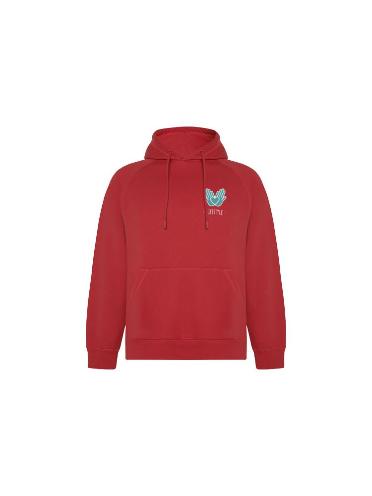 Bluza z kapturem unisex z bawełny organicznej i poliestru z recyklingu. Kieszeń kangurka. Pojedyncza dżersejowa podszewka w kapturze. Okrągły regulowany sznurek i haftowane oczka. Mankiety i pas z prążkowanego materiału 2×1. Usuwalna metka. Indywidualne opakowanie z recyklingu.