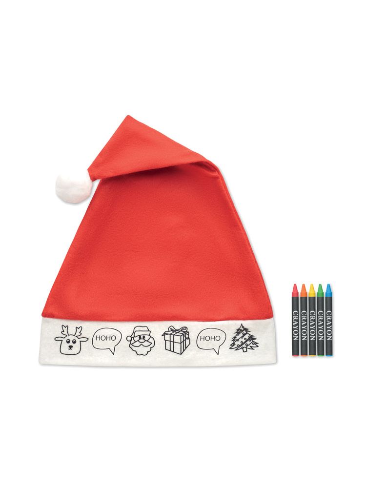 Dziecięca czapka Mikołaja z 5 kredkami i wzorem do pokolorowania.