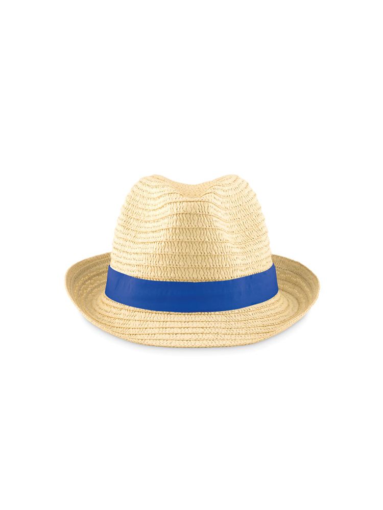 Kapelusz papierowo-słomkowy z kolorową gumką. W zamówieniach bez nadruku, rozcięta gumka dostarczana jest osobno.