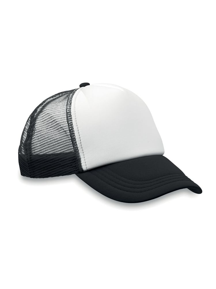 5-panelowa czapka typu trucker z regulowanym zapięciem na plastikowy zatrzask. Biały przedni panel oraz kolorowy daszek wykonany z poliestru i pianki (140-150 gr/m2 ). Pozostałe panele z kolorowej siatki. Rozmiar 7 1/4.