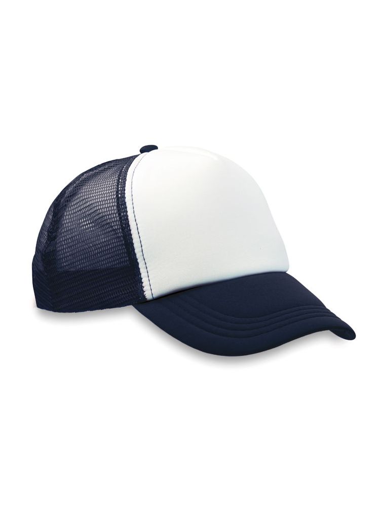 5-panelowa czapka typu trucker z regulowanym zapięciem na plastikowy zatrzask. Biały przedni panel oraz kolorowy daszek wykonany z poliestru 140-150 gr/m2 i pianki. Pozostałe panele z kolorowej siatki. Rozmiar 7 1/4.