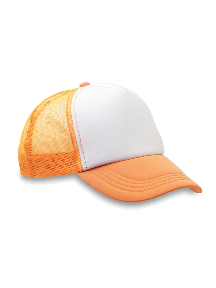 5-panelowa czapka typu trucker z regulowanym zapięciem na plastikowy zatrzask. Biały przedni panel oraz kolorowy daszek wykonany z poliestru 140-150 gr/m2 i pianki. Pozostałe panele z kolorowej siatki. Rozmiar 7 1/4.