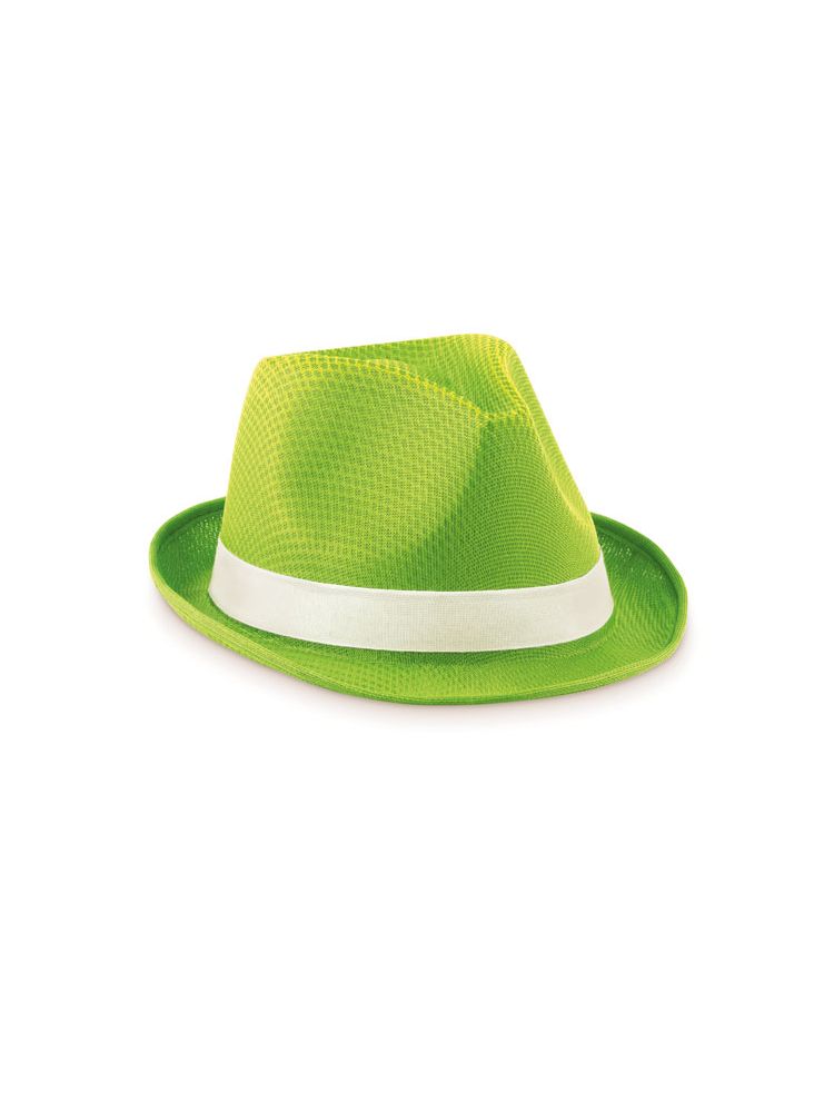 Kolorowy kapelusz z poliestrowej słomki z białą opaską. W przypadku zamówień bez nadruku taśma będzie dostarczona osobno.