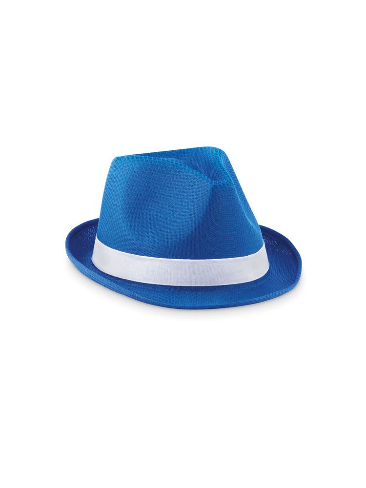 Kolorowy kapelusz z poliestrowej słomki z białą opaską. W przypadku zamówień bez nadruku taśma będzie dostarczona osobno.