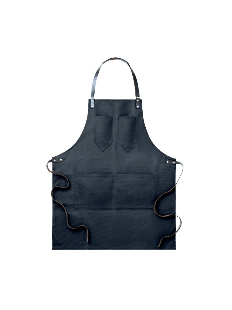 Fartuch z woskowanego płótna z elementami ze skóry. Regulowany pasek, 2 mniejsze kieszenie i 1 większa w dolnej części fartucha.