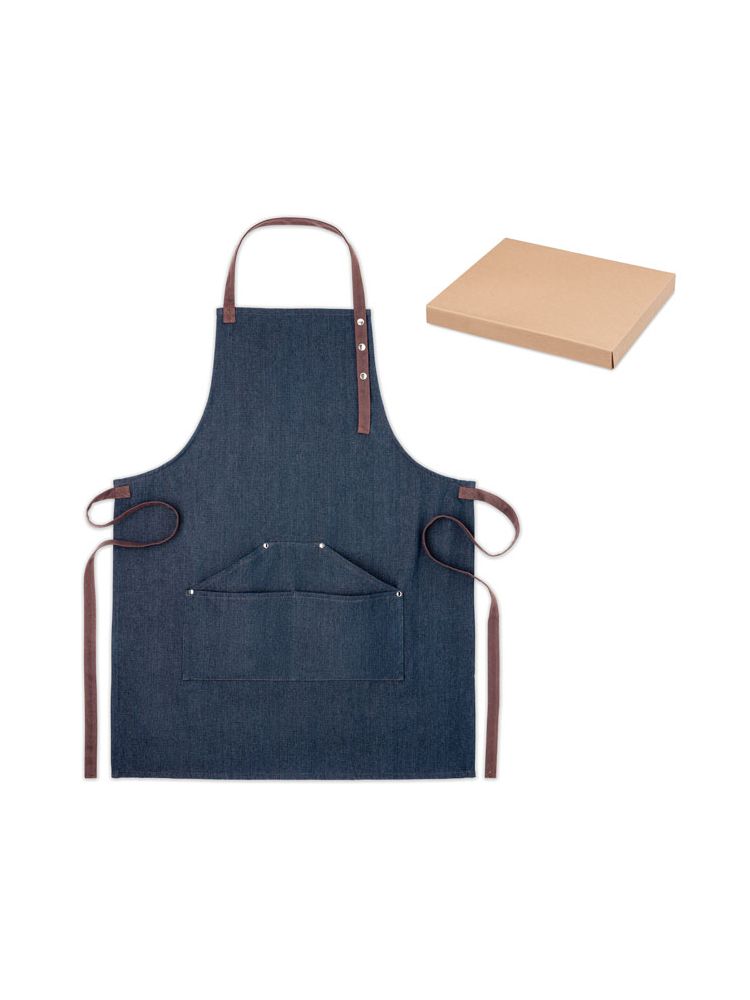 Regulowany fartuch kuchenny z 3 kieszeniami z przodu, z dżinsu 240 gr/m² z bawełnianymi paskami. Pakowany w indywidualne pudełko.