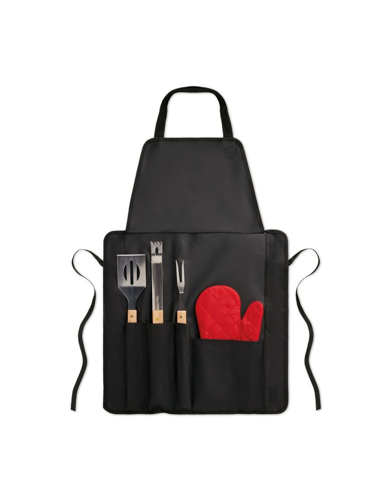 Fartuch do barbecue z 3 narzędziami do grilla i rękawicą. Fartuch z poliestru 600D.