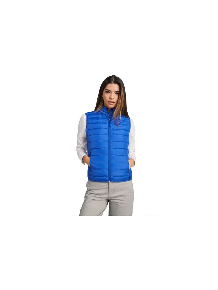 Damska kamizelka z materiału przypominającego w dotyku pierze. Dopasowane odwrócone zamki błyskawiczne. Dwie kieszenie z przodu zapinane na zamek. Kontrastowa wewnętrzna podszewka. Dopasowane elastyczne wykończenie u dołu. Lekka i składana odzież. Dopasowany krój. Wodoodporność. Model wiatroszczelny.