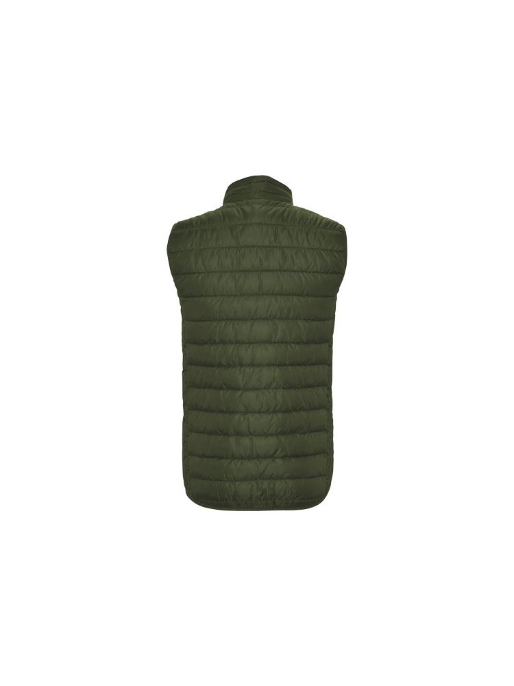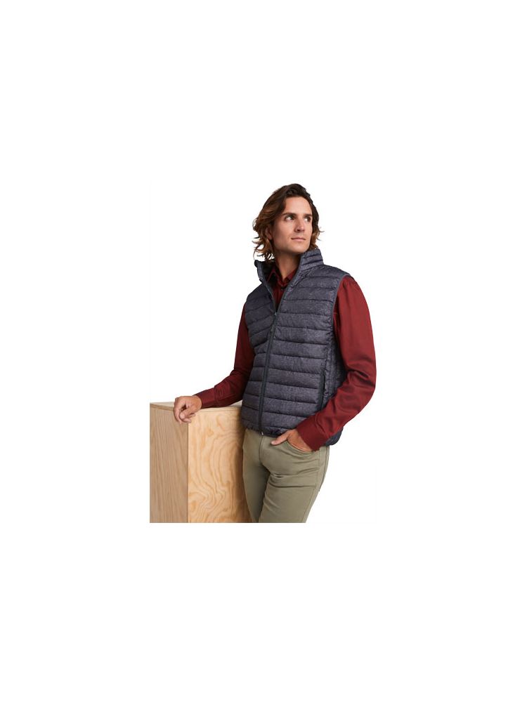 Kamizelka męska z materiału przypominającego w dotyku pierze. Dopasowane odwrócone zamki błyskawiczne. Dwie kieszenie z przodu zapinane na zamek. Kontrastowa wewnętrzna podszewka. Dopasowane elastyczne wykończenie u dołu. Lekka i składana odzież. Dopasowany krój w modelu damskim. Wodoodporność. Model wiatroszczelny.