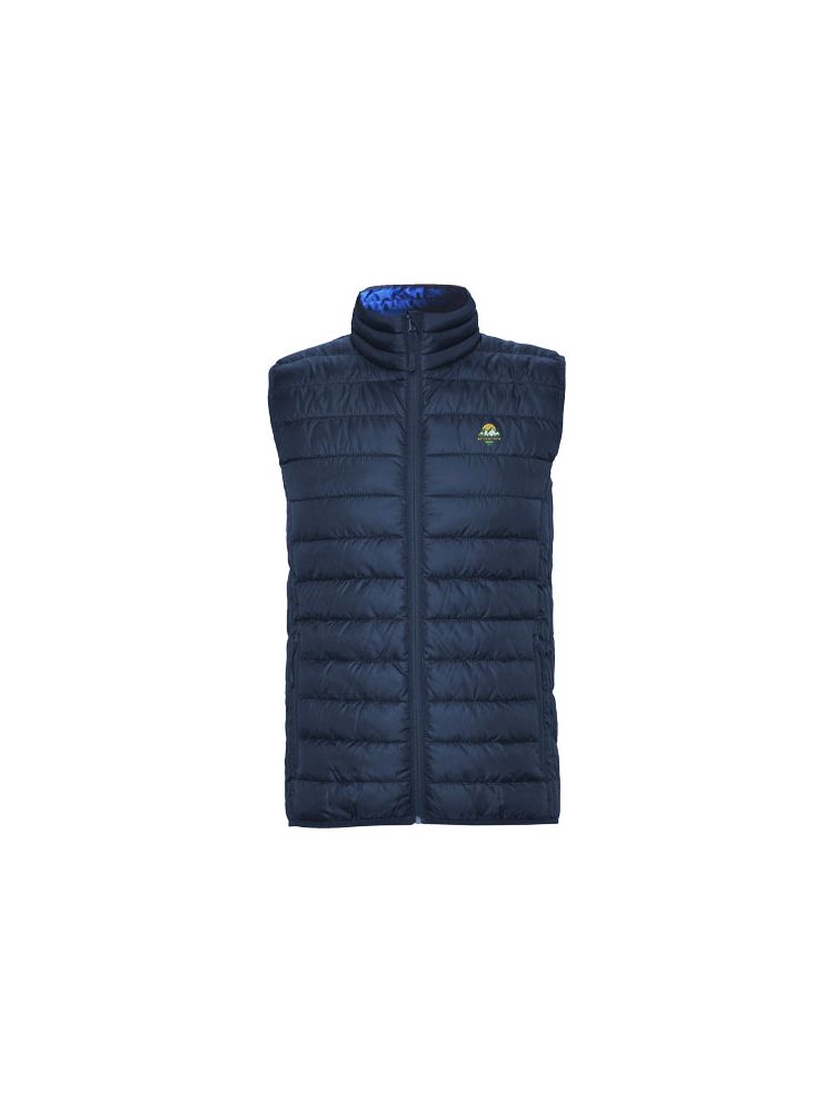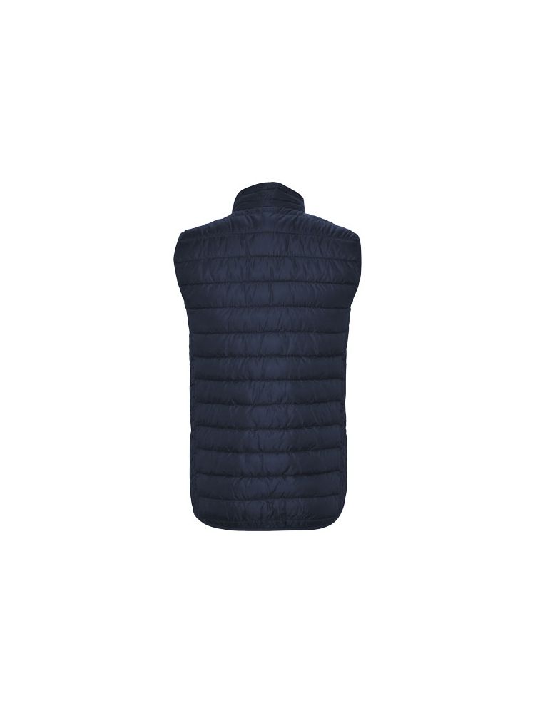 Kamizelka męska z materiału przypominającego w dotyku pierze. Dopasowane odwrócone zamki błyskawiczne. Dwie kieszenie z przodu zapinane na zamek. Kontrastowa wewnętrzna podszewka. Dopasowane elastyczne wykończenie u dołu. Lekka i składana odzież. Dopasowany krój w modelu damskim. Wodoodporność. Model wiatroszczelny.