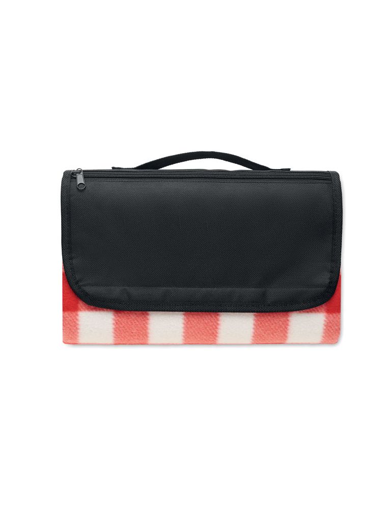 Składany koc piknikowy z polaru RPET 150 gr/m² z wodoodporną powłoką PEVA na jednej stronie. Zawiera przednią kieszeń na suwak i krótki pasek do przenoszenia.