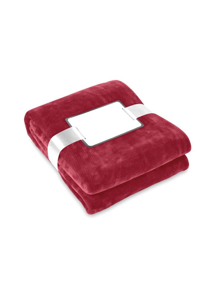 Koc 280g/m² z miłego, miękkiego polaru, przewiązany wstążką, posiada bilecik do nadruku.