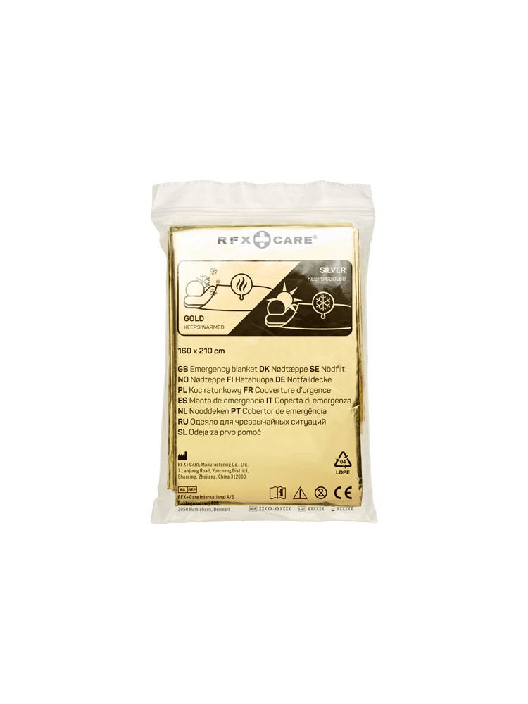 Koc ratunkowy, który zapewnia ochronę przed ciepłem, zimnem i wilgocią. Doskonale sprawdza się w przypadku wycieczek kempingowych, imprez sportowych i sytuacji kryzysowych. Gdy srebrna strona skierowana jest w stronę ciała, zapewnia ochronę przed zimnem. Skierowanie złotej strony w stronę ciała zapewnia utrzymanie chłodu. Rozmiar koca to 160×210 cm. Koc jest objęty przepisami, przetestowany i certyfikowany jako wyrób medyczny klasy I zgodnie z Dyrektywą o wyrobach medycznych MDD 93/42/EEC z dnia 14 czerwca 1993 roku.