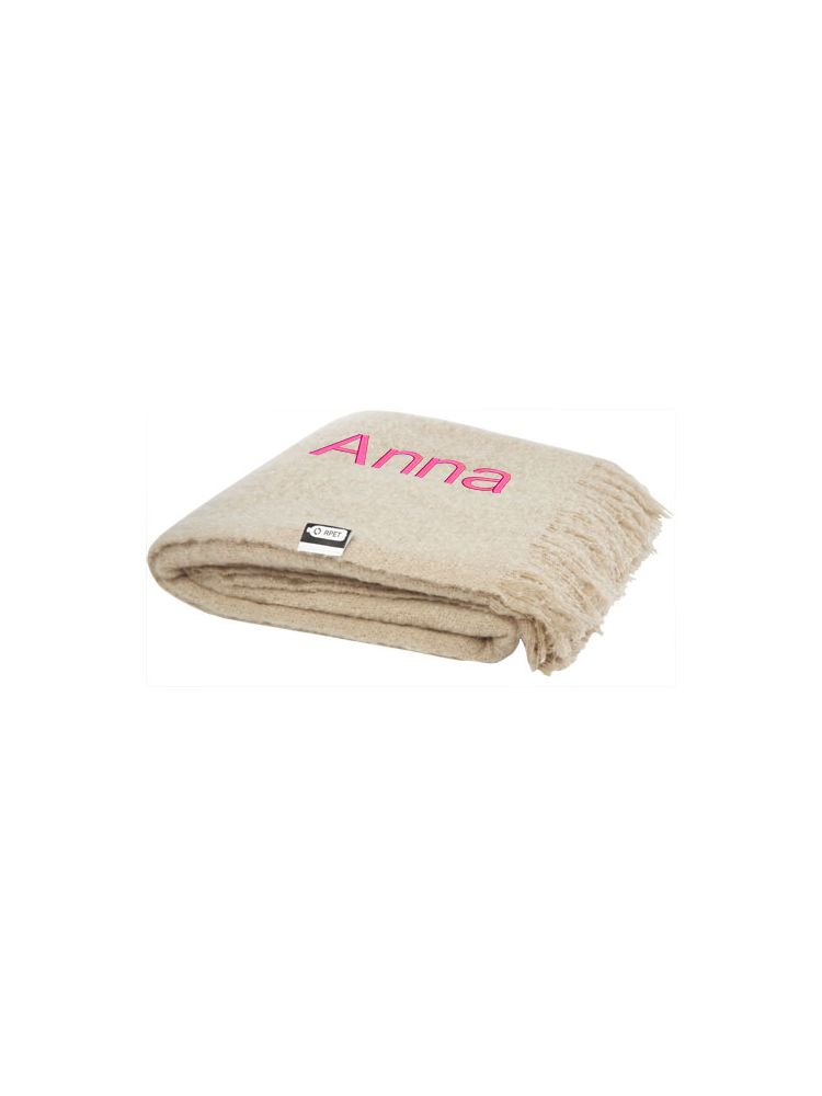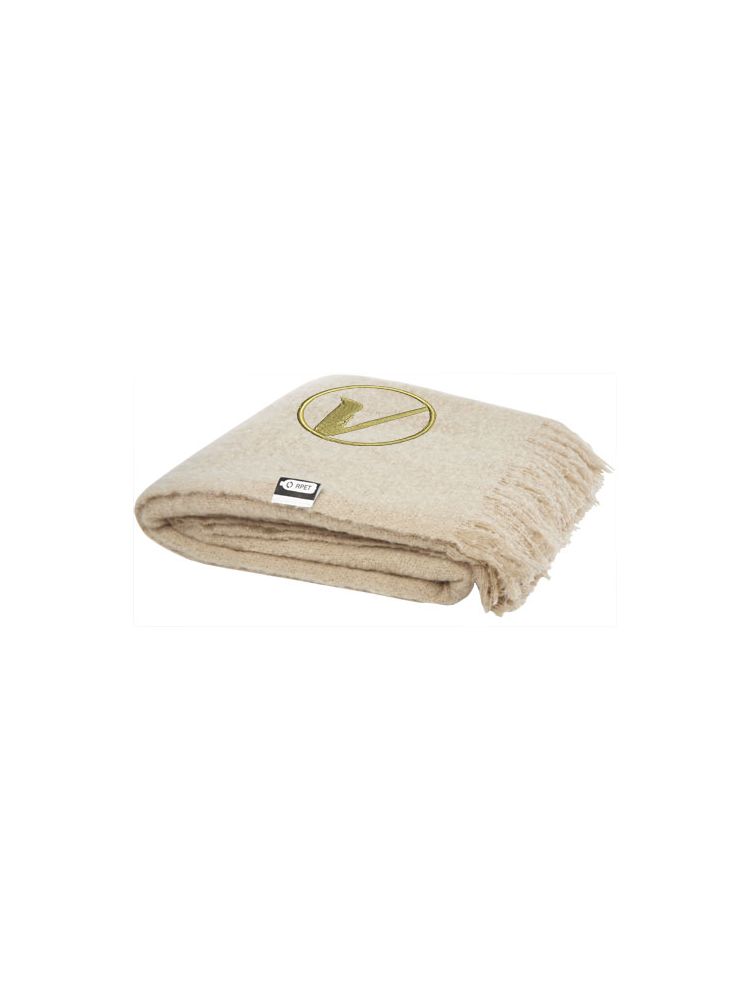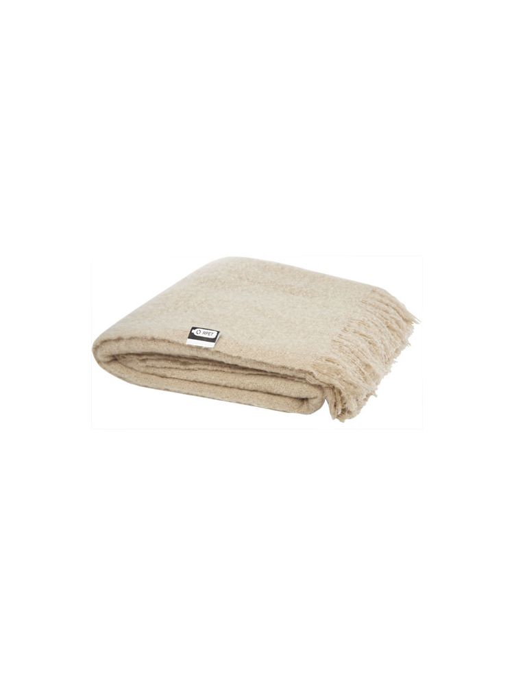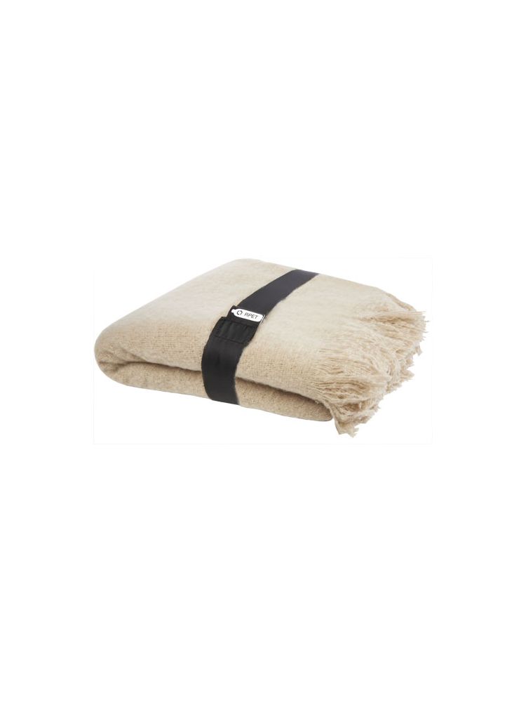 Niezwykle miękki koc z plastiku z recyklingu, owinięty wstążką z plastiku 190T z recyklingu. Pakowane w torebkę z polietylenu pochodzącego z recyklingu. Długość frędzli: 10 cm z każdej strony. Rozmiar wstążki: 72 cm x 4 cm.