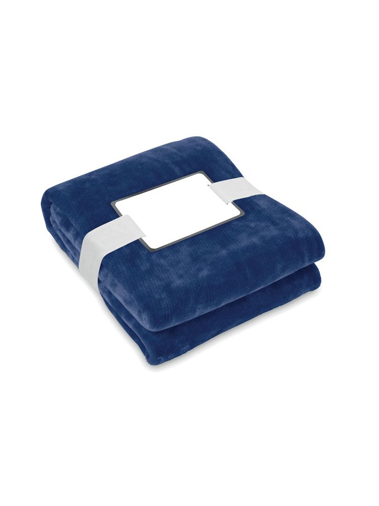 Koc z flaneli RPET 280 gr/m² ze wstążką i etykietą do nadruku.