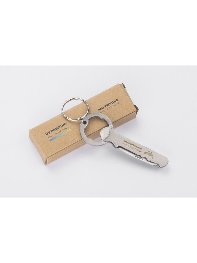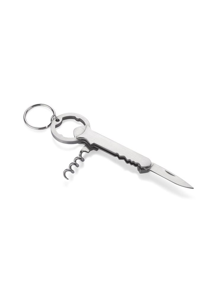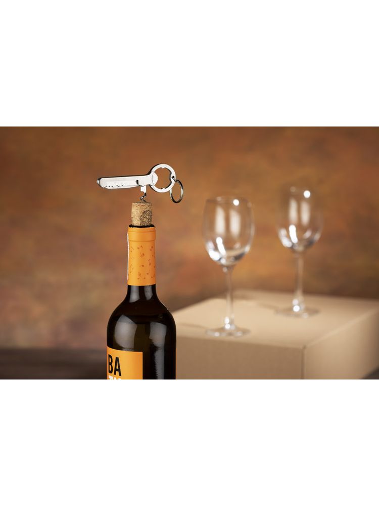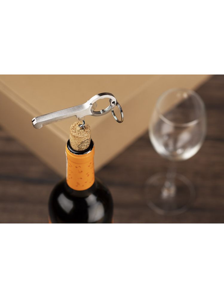 Alco posiada 3 funkcje: brelok, otwieracz do kapsli oraz korkociąg do wina. Wykonany ze stali nierdzewnej. Zapakowany w brązowy kartonik.