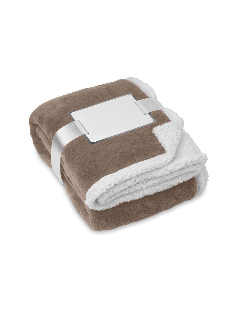 Koc z miłego,miękkiego polaru o gramaturze 200g/m2, z podszewką Sherpa 220g/m2.Przewiązany wstążką. Bilecik do nadruku.