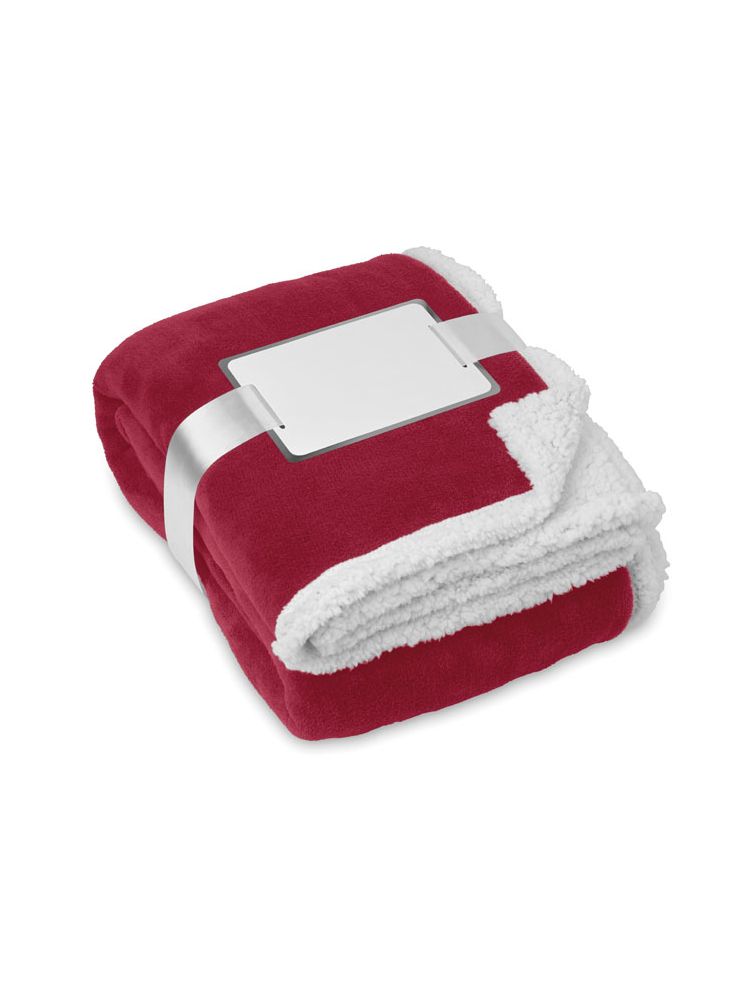 Koc z miłego, miękkiego polaru o gramaturze 200g/m2, z podszewką Sherpa 220g/m2.Przewiązany wstążką. Bilecik do nadruku.