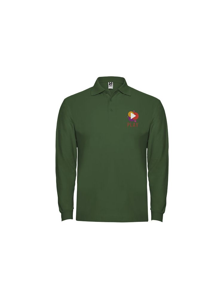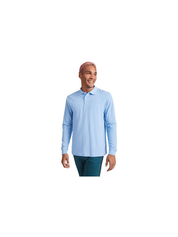 Koszulka polo z długim rękawem, prążkowanym kołnierzykiem i mankietami, zapięciem na 3 guziki i prążkowanymi mankietami 1×1 z elastanu. Wzmocnione kryte szwy w kołnierzyku. Opcjonalna kieszeń. Usuwalna metka.