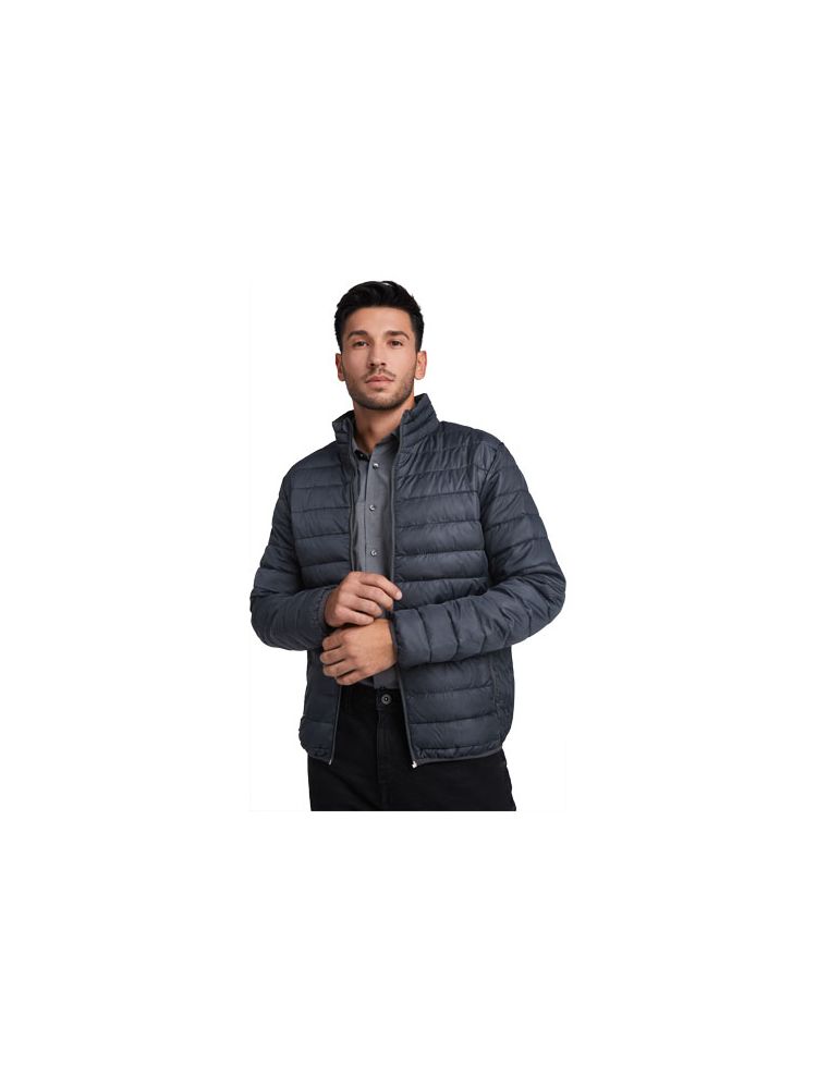 Męska kurtka pikowana z wypełnieniem imitującym w dotyku pierze. Odwrócone zamki błyskawiczne z dopasowanym ochraniaczem podbródka i ściągaczem. Dwie przednie kieszenie z zamkami błyskawicznymi. Dopasowana elastyczna lamówka w kołnierzu, mankietach i u dołu. Kontrastowa podszewka wewnętrzna. W zestawie torba transportowa. Lekka i składana odzież. Usuwalna metka. Wodoodporna. Wiatroszczelna.
