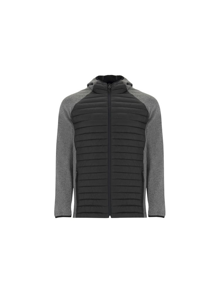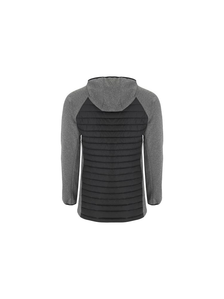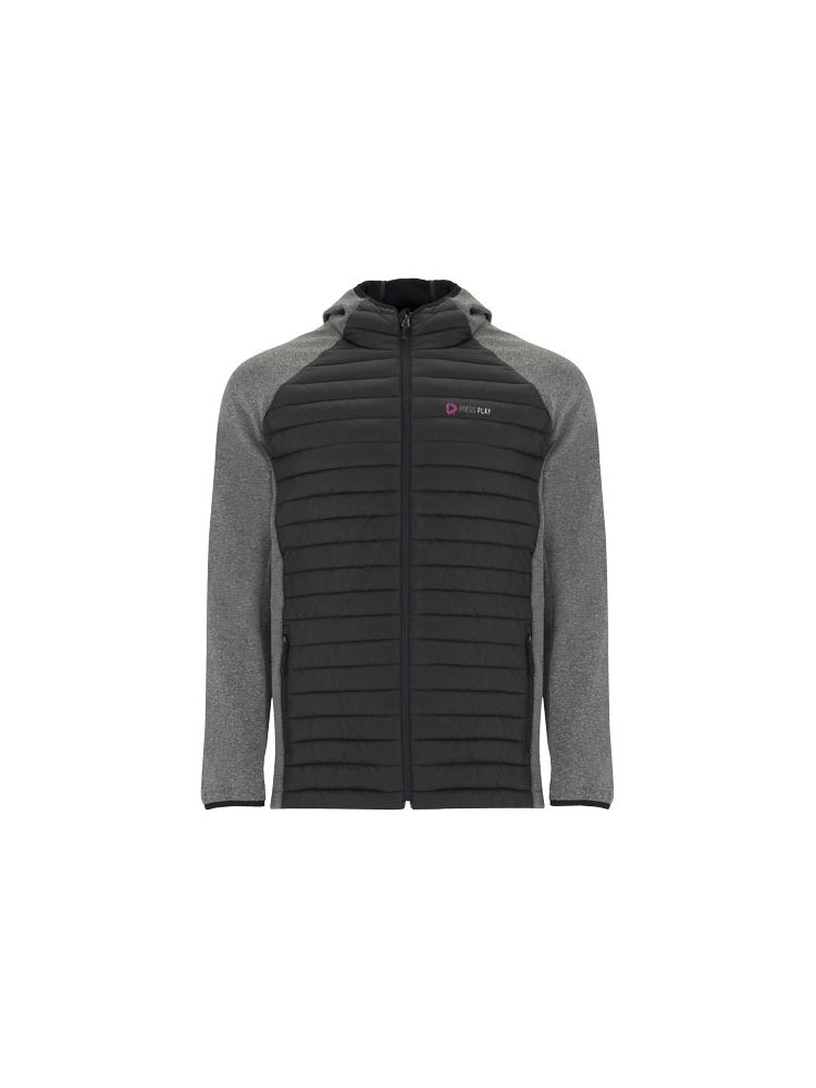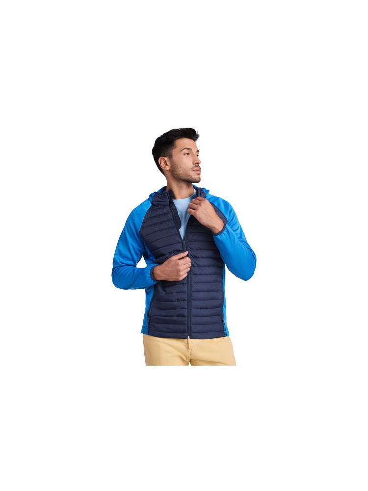 Męska kurtka z kombinacji dwóch materiałów: Regulowany kaptur. Raglanowe rękawy. Rękawy, panele boczne i kaptur z materiału softshell. Pikowany materiał przypominający w dotyku pierze z przodu i z tyłu. Odwrócony zamek błyskawiczny z pasującym ochraniaczem podbródka i ściągaczem. Dwie przednie kieszenie z zamkami błyskawicznymi. Dopasowane elastyczne wykończenie kołnierza, mankietów i dołu bluzy. Usuwalna metka. Model wiatroszczelny.