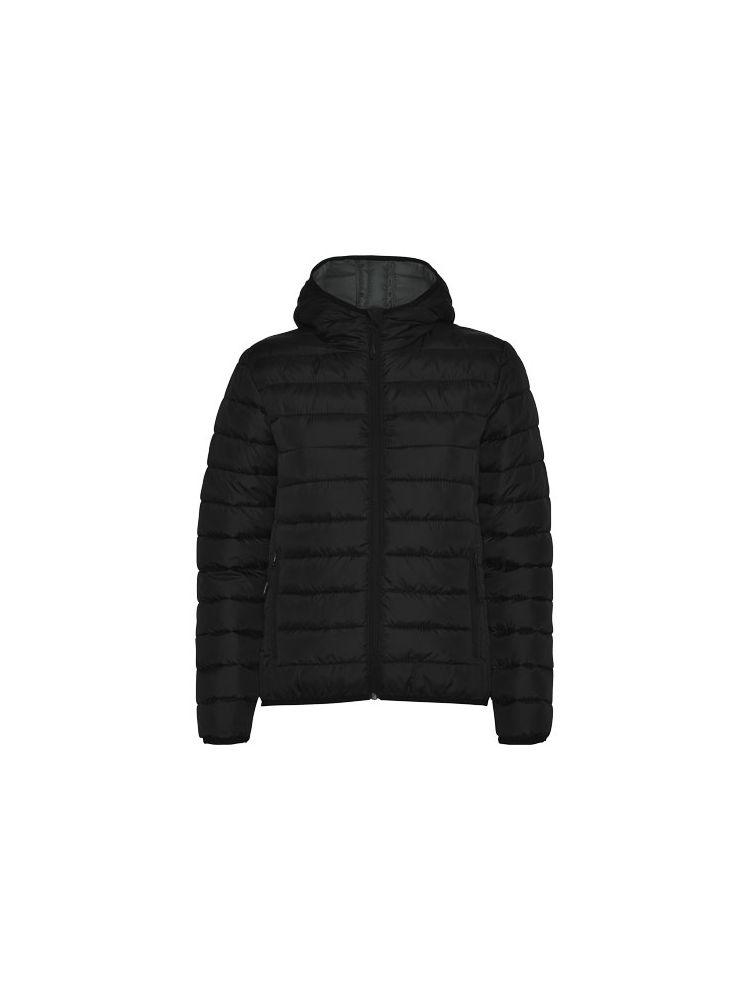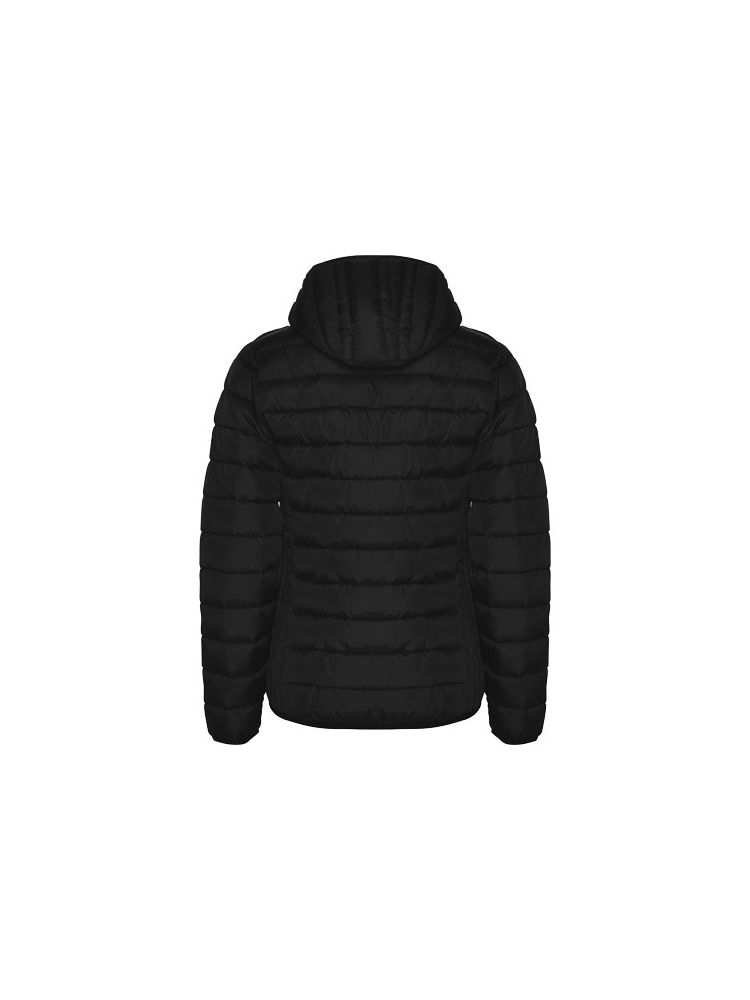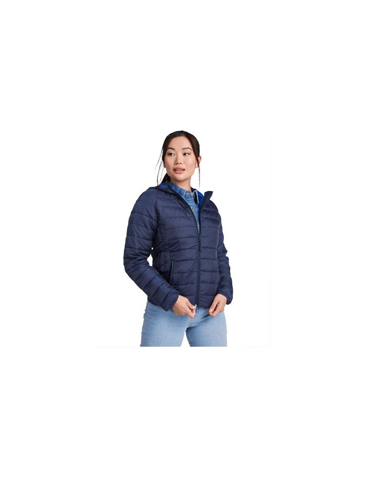 Damska pikowana kurtka z dopasowanym kapturem z materiału przypominającego w dotyku pierze. Odwrócone zamki błyskawiczne z dopasowaną osłoną podbródka. Dwie przednie kieszenie zapinane na zamek. Dopasowane elastyczne wykończenia mankietów, dołu i kaptura. Kontrastowa wewnętrzna podszewka. Dołączona torba transportowa. Lekka i składana odzież. Dopasowany krój. Wodoodporna. Model wiatroszczelny.