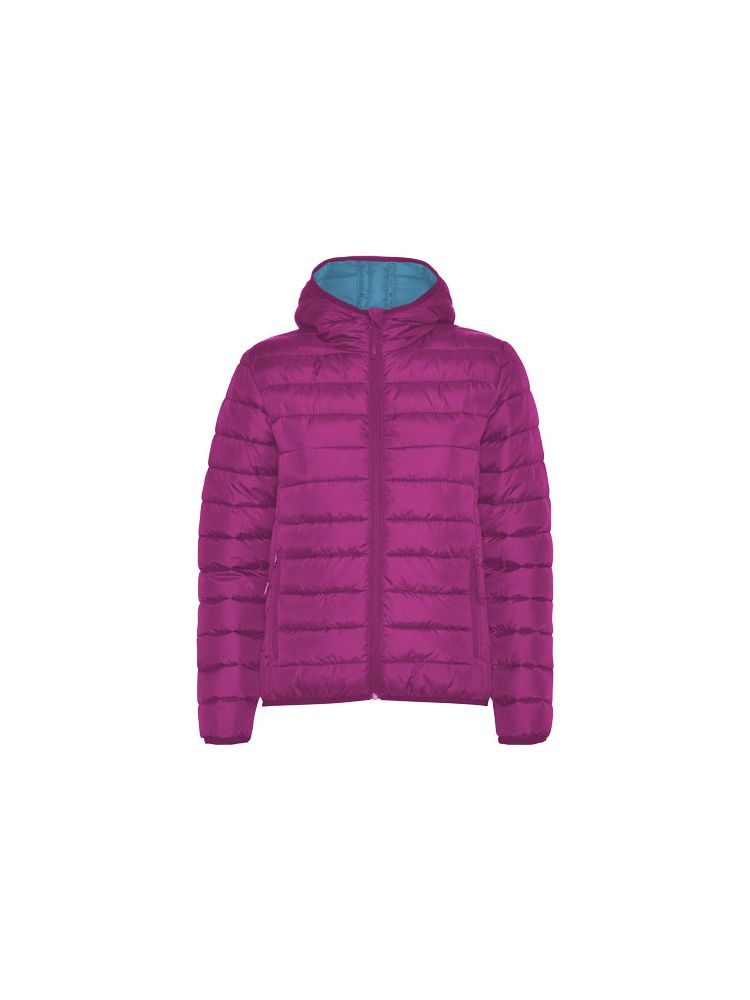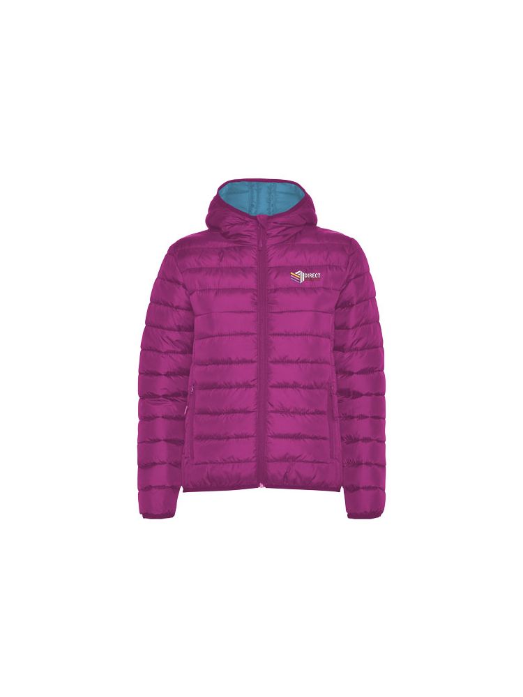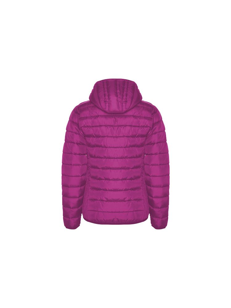 Damska pikowana kurtka z dopasowanym kapturem z materiału przypominającego w dotyku pierze. Odwrócone zamki błyskawiczne z dopasowaną osłoną podbródka. Dwie przednie kieszenie zapinane na zamek. Dopasowane elastyczne wykończenia mankietów, dołu i kaptura. Kontrastowa wewnętrzna podszewka. Dołączona torba transportowa. Lekka i składana odzież. Dopasowany krój. Wodoodporna. Model wiatroszczelny.