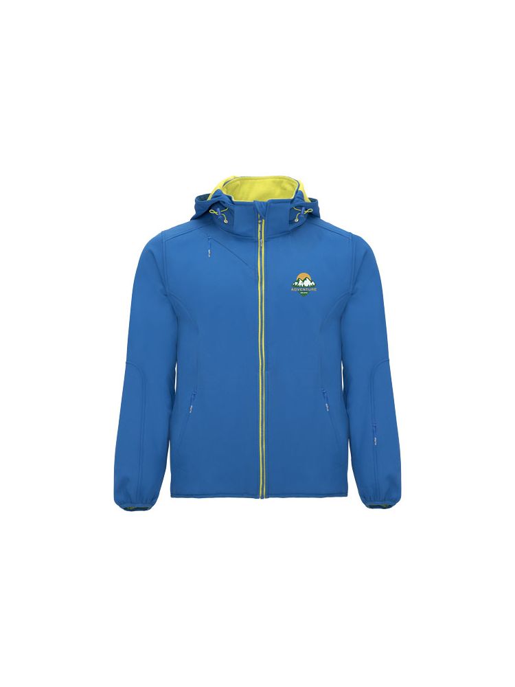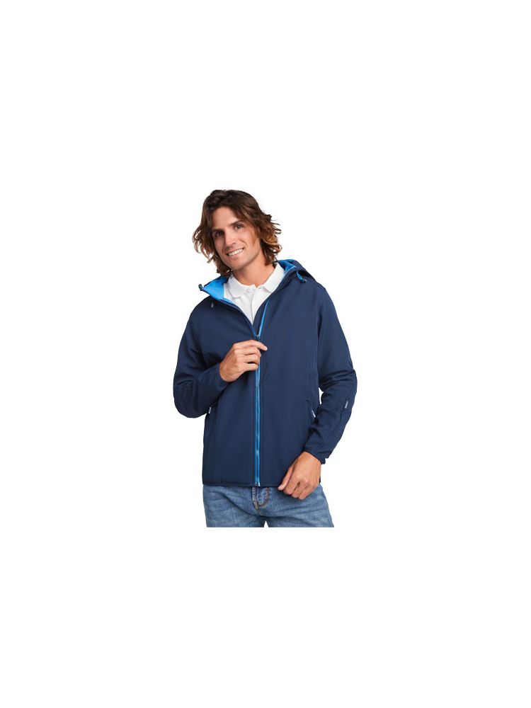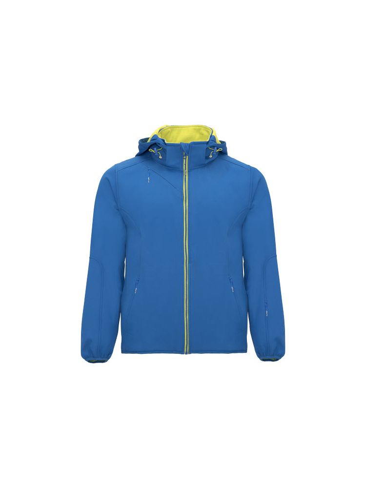 2-warstwowy softshell o sportowym kroju: Kontrastowy centralny zamek błyskawiczny z ochraniaczem podbródka i ściągaczem. Wewnętrzna podszewka z kontrastowego mikropolaru. Zewnętrzna kieszeń na prawej piersi z niewidocznym zamkiem błyskawicznym po przekątnej. Dwie kieszenie boczne z niewidocznym zamkiem błyskawicznym. Kieszeń na lewym rękawie. Dopasowane elastyczne wykończenie mankietów i dołu. Składany kaptur z kontrastową mikropolarową podszewką. Usuwalna metka. Wodoodporna. Wiatroszczelna.
